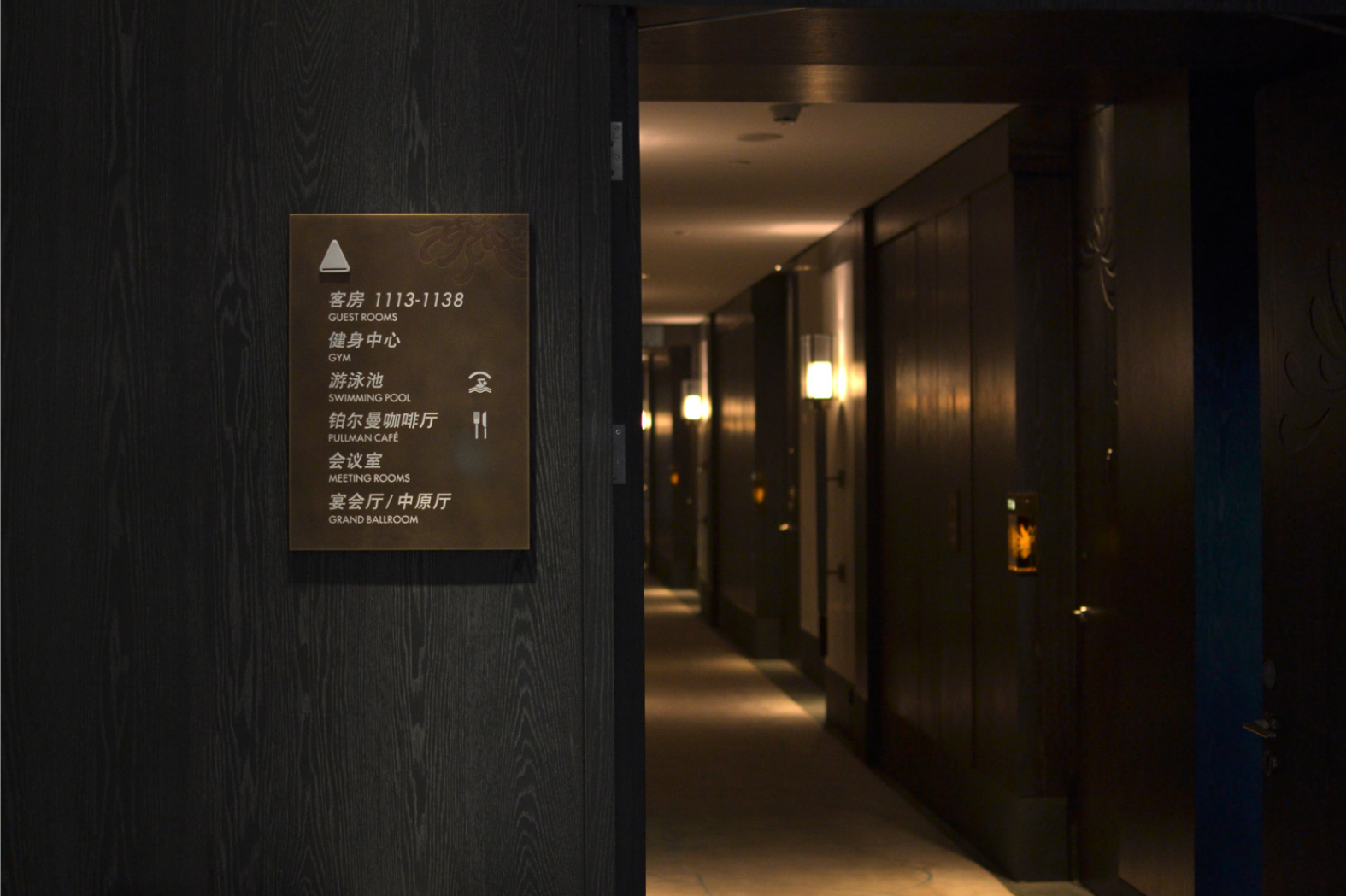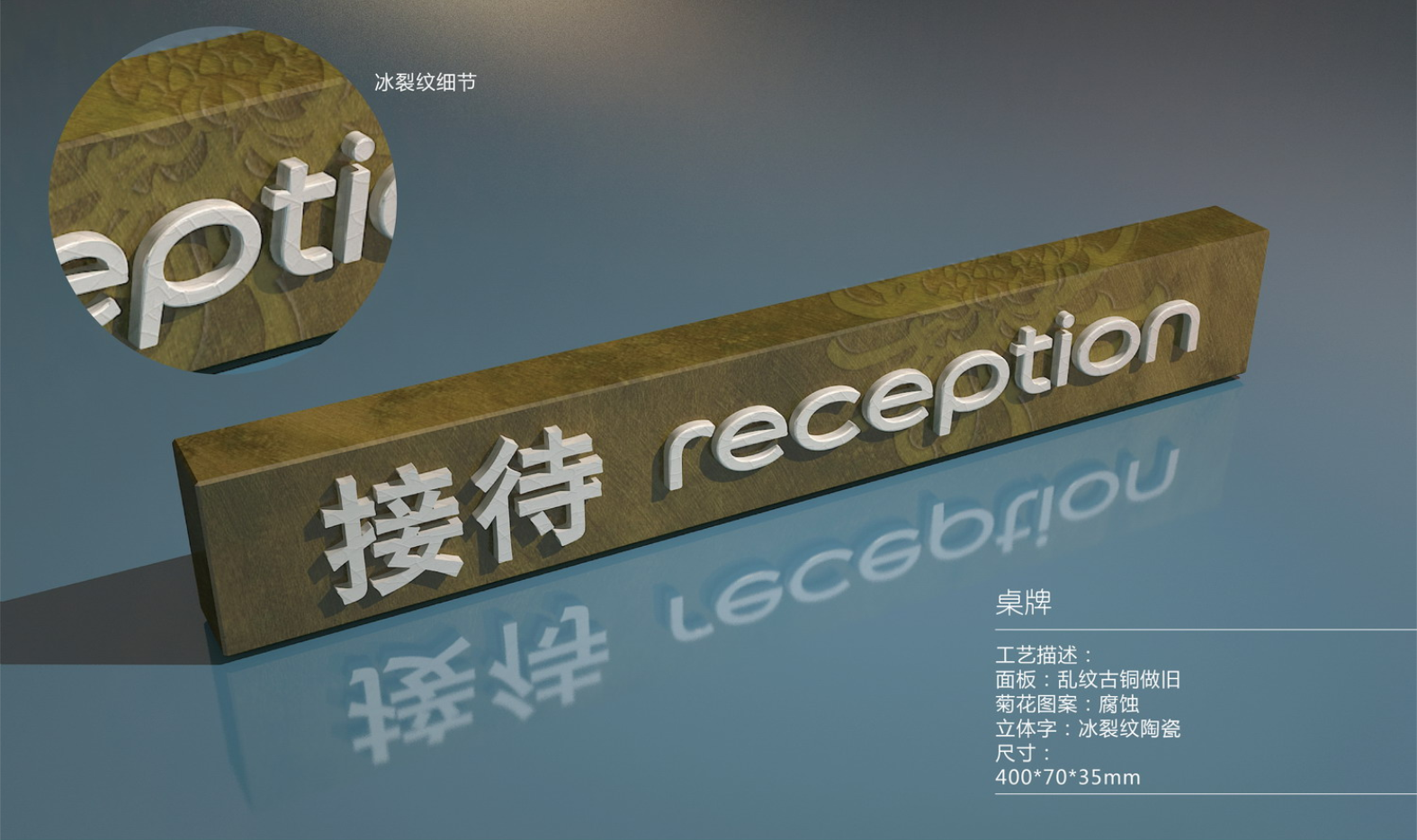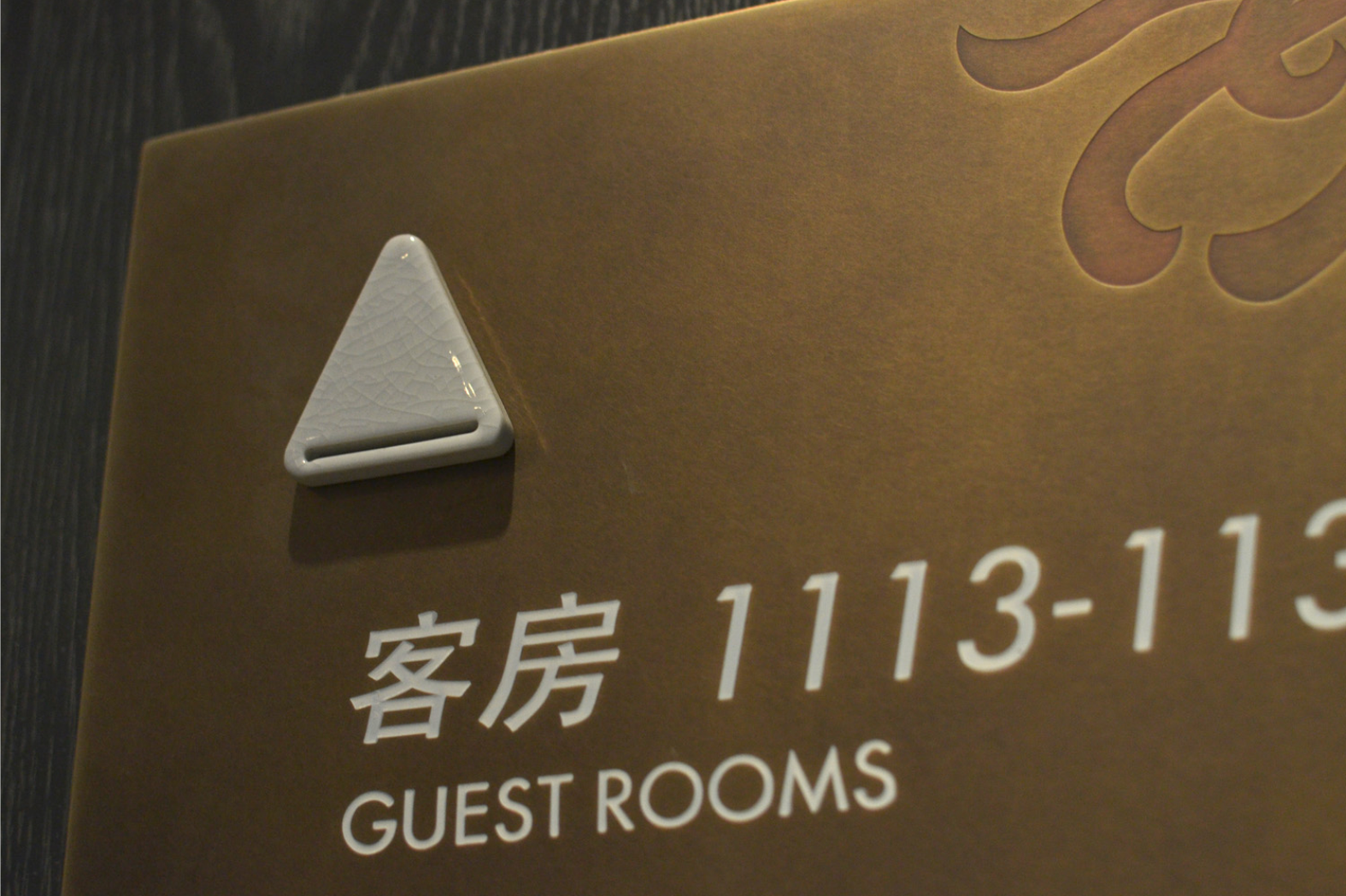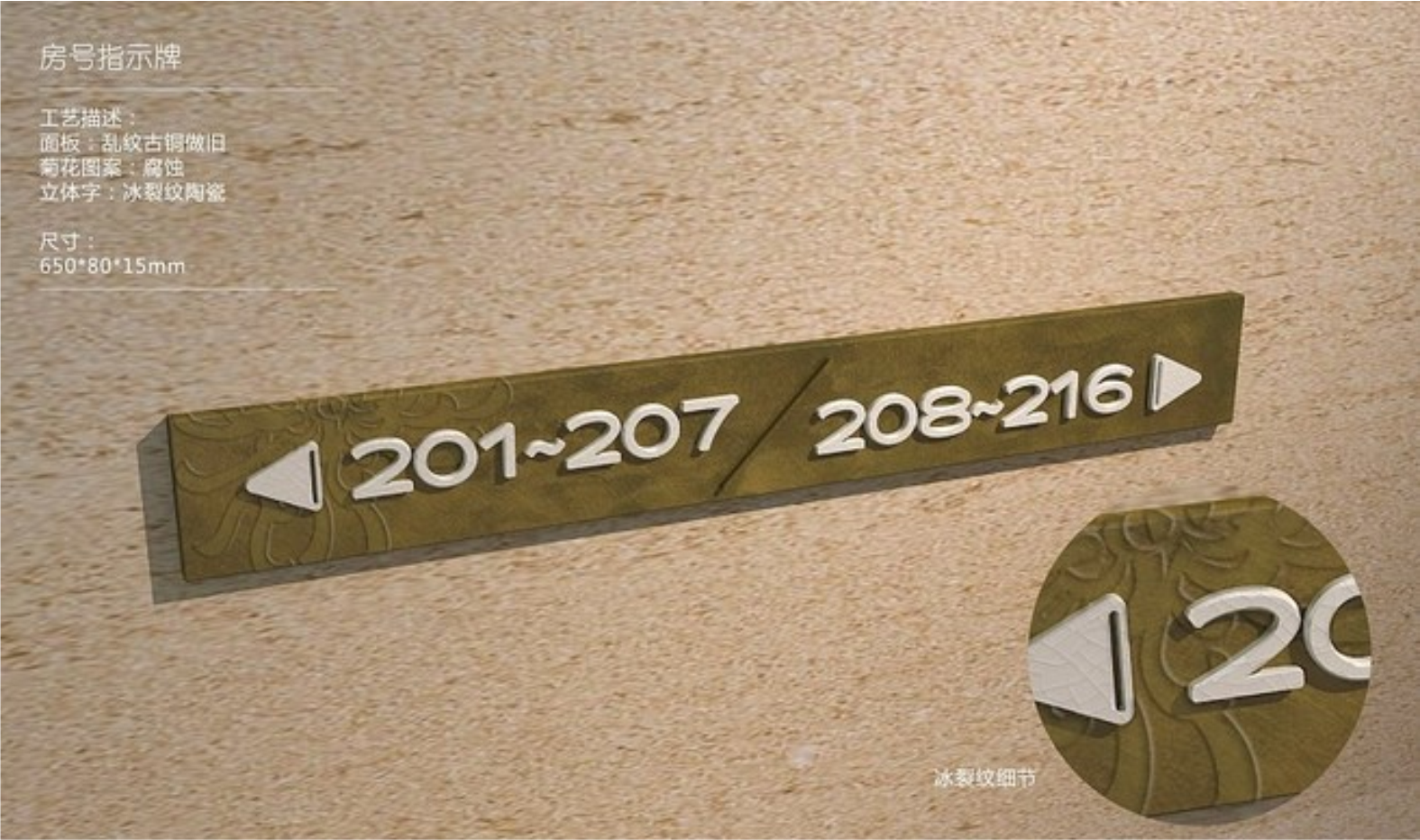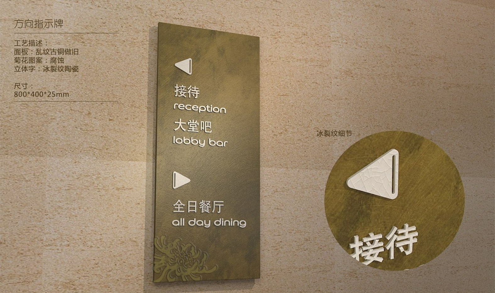 设计思路:由于铂尔曼酒店的建筑结果灵感来自古老而永恒的中国概念,所以酒店里标识的面板用的是乱纹古铜做旧,菊花的图案是腐蚀,立体字我们用的是冰裂纹陶瓷。