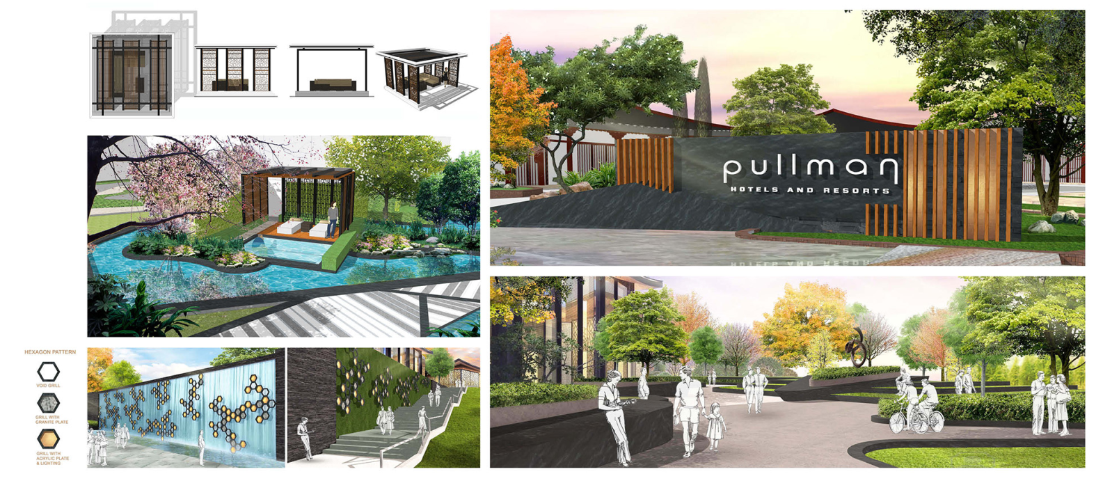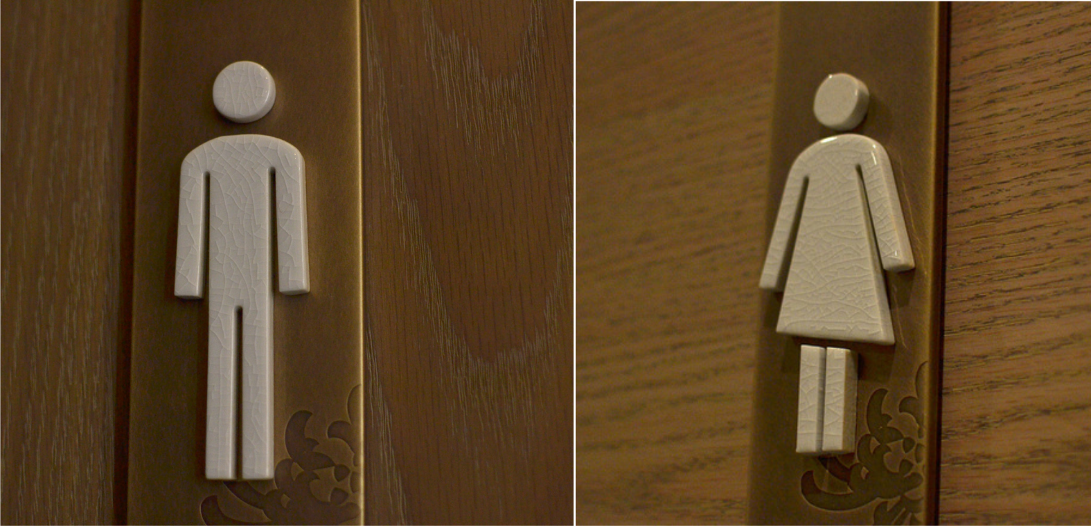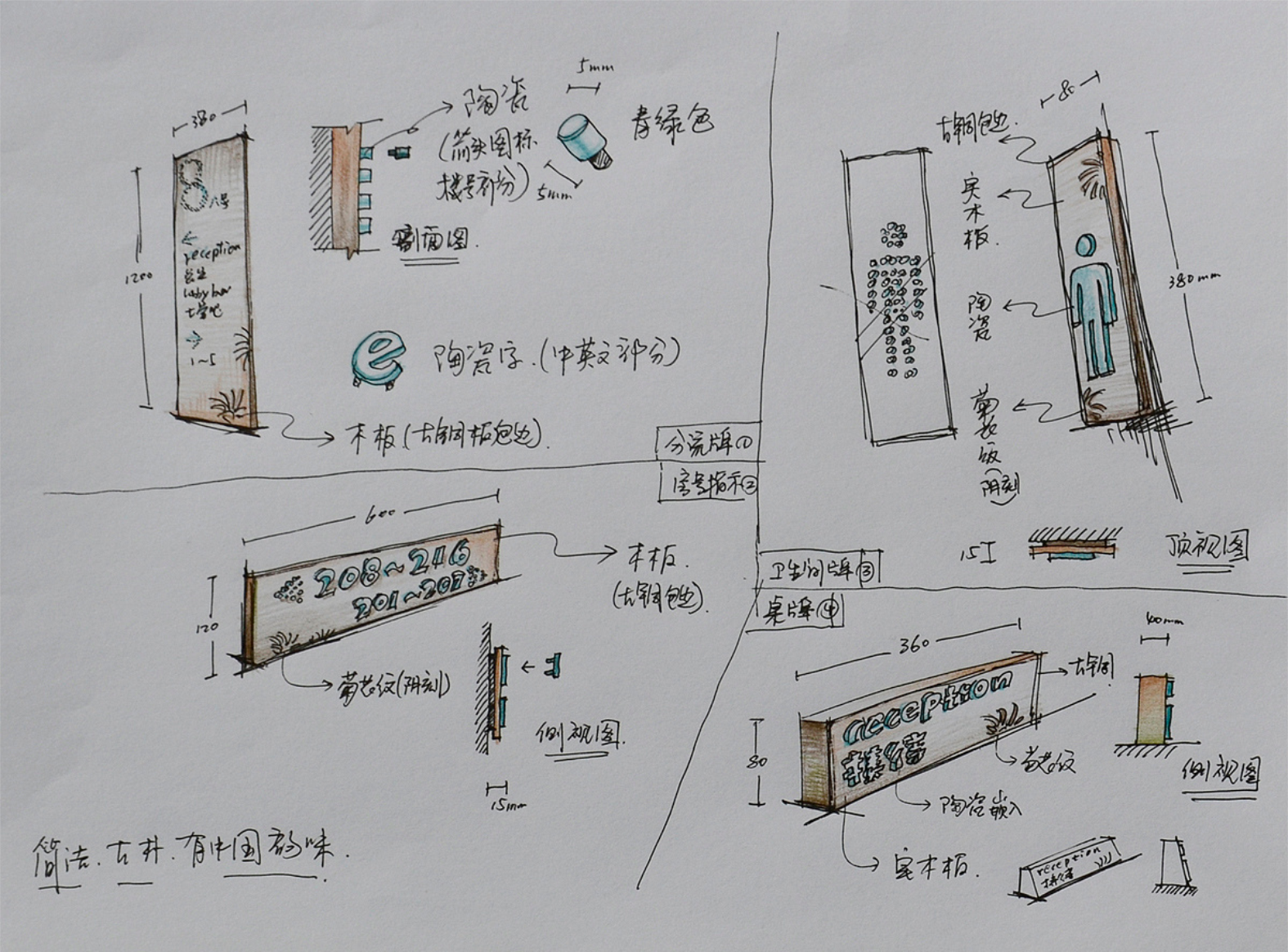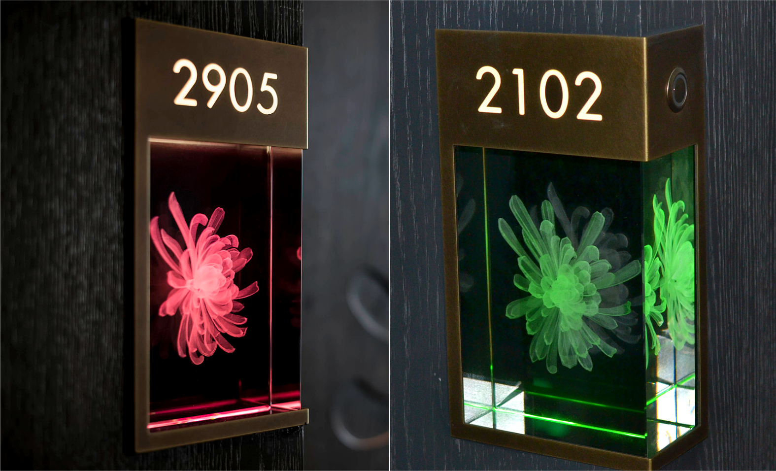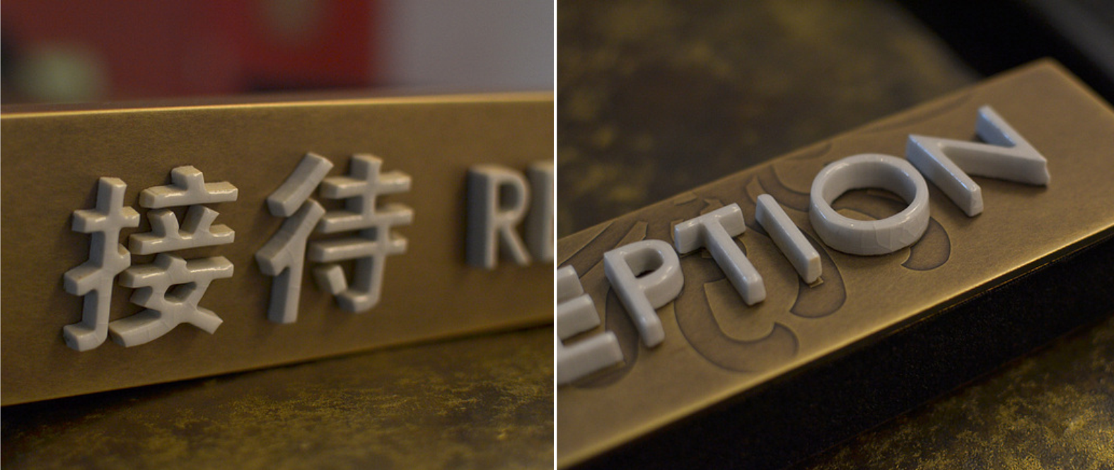设计思路:由于铂尔曼酒店的建筑结果灵感来自古老而永恒的中国概念,所以酒店里标识的面板用的是乱纹古铜做旧,菊花的图案是腐蚀,立体字我们用的是冰裂纹陶瓷。
