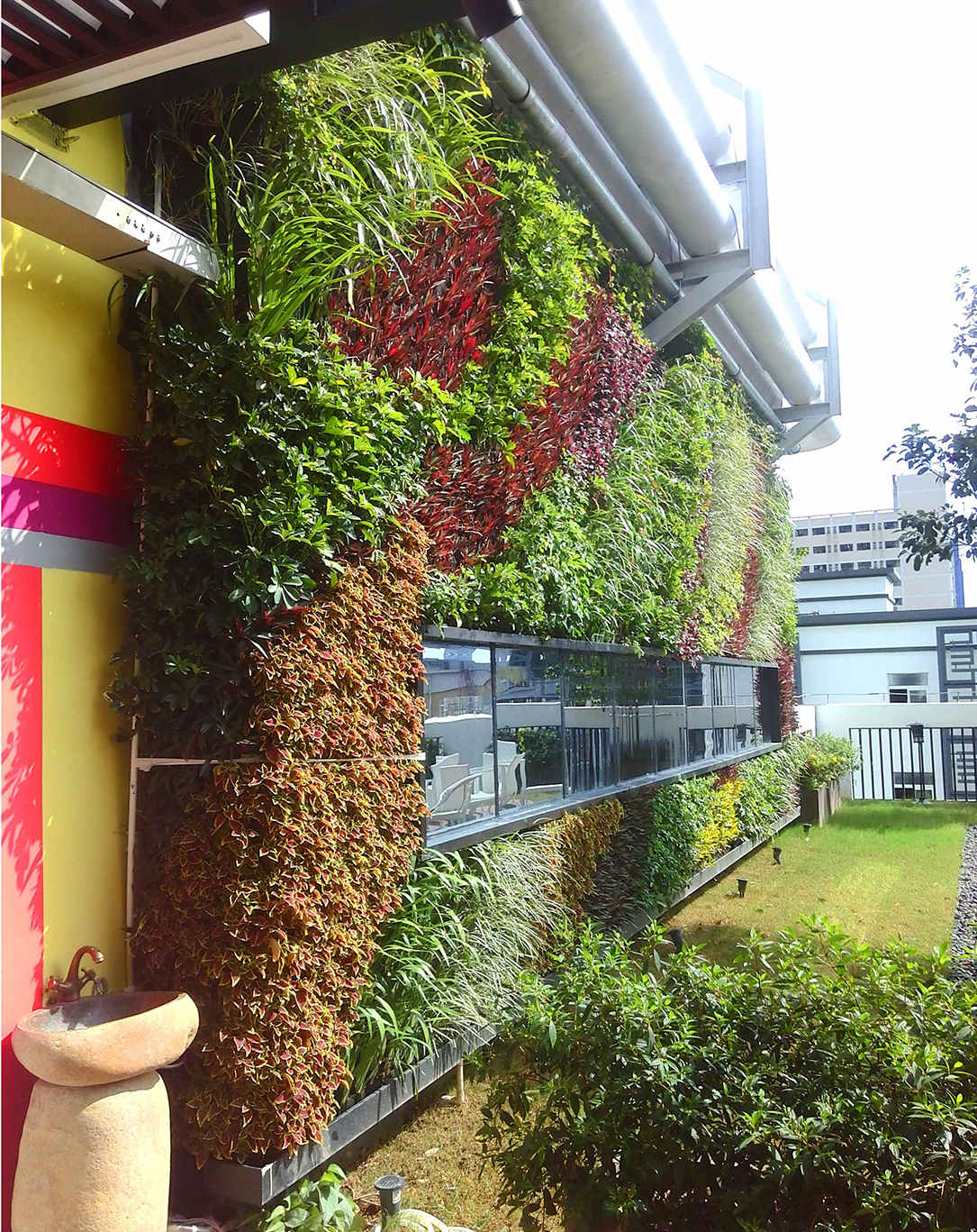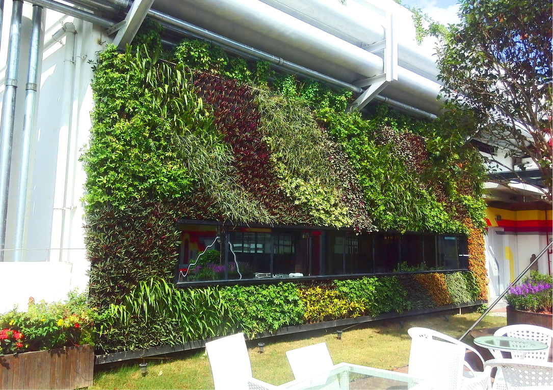 高层建筑立体绿化对技术和安全性要求更高。润城在丰富的建筑立体绿化基础上,研发出一系列的专门针对高层垂直绿化产品体系。其中深圳福田环境监测大楼是深圳标志性绿色低碳建筑,被评为国家三星级及深圳铂金级绿色建筑。外墙的垂直绿化由润城生态深化设计及施工完成。东面垂直绿化墙最高67.5米,是目前国内最高的垂直绿化项目。本项目运用的高层模块固定结构能将垂直绿化模块两两结合,提升系统整体的稳固性,达到防风防坠落的要求,同时将灌溉水流与钢架分离,进一步提升安全性。