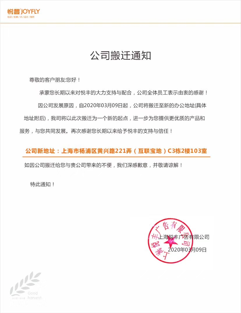2020年 3月 9日是上海悦丰广告有限公司乔迁之日(具体地址请查阅附件通知文件),全体员工热情高涨,衷心祝愿公司乔迁吉祥,业务蒸蒸日上!